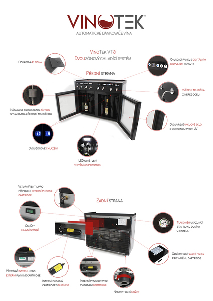 Hlavní výhodou systému VinoTek oproti chladničkám na víno je schopnost zachovávat jakostní vlastnosti vína až 30 dní po otevření. Toho je dosaženo pomocí ochranné argonové atmosféry.