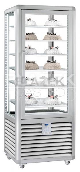 Panoramatická mrazící vitrína CGL 450 S určena pro vysoce efektivní prezentaci a uchovávání mražených dortů a zákusků na pevných mrazících roštových policích. Vitrína je v elegantním celokovovém provedení (Al profil), výkonné statické chlazení s vlhkostí 40 %, manuální odtávání, úsporný kompresor nové generace, vrstvené nemlživé sklo, 2x LED vertikální osvětlení v rozích, kolečka (2 s brzdou), křídlové dveře, elektronické ovládání s digitálním teploměrem.