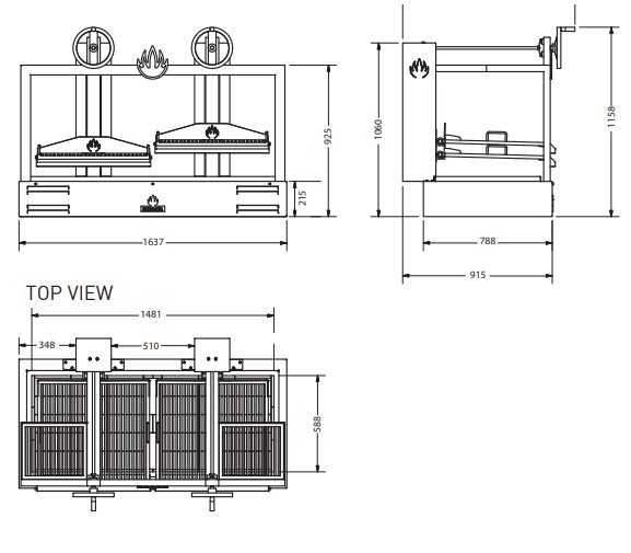 Na dřevěné uhlí 2x rošt 685x635 mm Rozměry: Š 1637 H 906 V 1155 mm Výkon: 5,2 kW Doba zapálení: 30 min. Doba hoření: cca 7 h Provozní teplota: 250 °C Počáteční množství uhlí: 23 Kg Požadavek na VZT: 4600 m3/h Hmotnost: 525 Kg