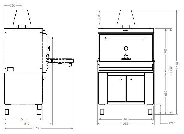 Rozměr: 920x700x1710 vč. komínku Rozměr grilovacího roštu: 760×595 mm Grilovací teplota: 250-350°C Kapacita grilu: cca 110 - 130 jídel Doba nahřátí: 45min Doporučené množství uhlí na zapálení: 15 kg Přibližný čas hoření : 8 hodin Požadavek na odtah: 3200m3 / hod Ekvivalent výkonu: 5 kw Hmotnost: 491 Kg Barva dveří trouby: nerez/černá/červená/žlutá/modrá
